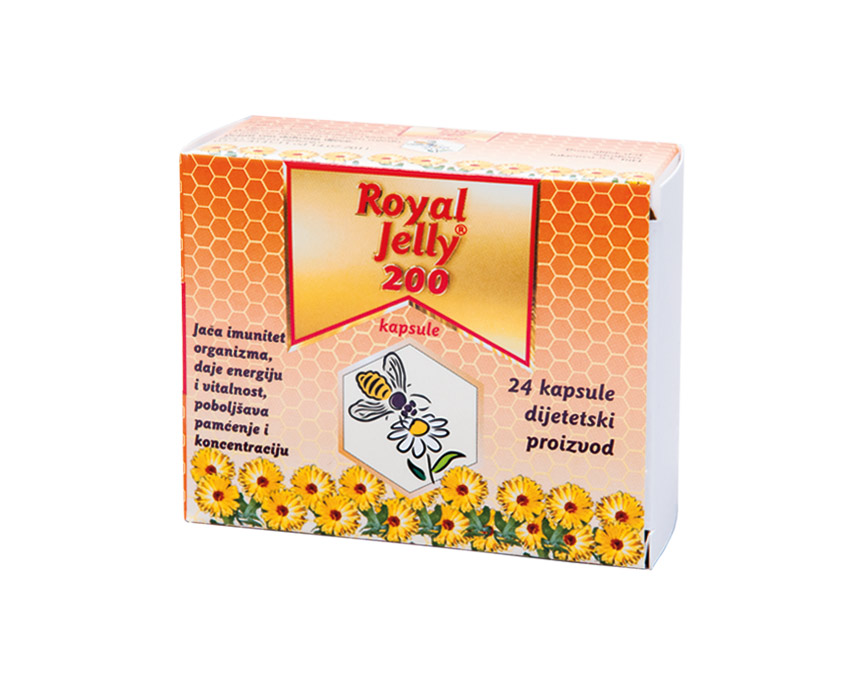 ROYAL JELLY 200 kapsule se primjenjuju za jačanje prirodne odbrane organizma tokom bolesti i u periodu oporavka od bolesti.Za poboljšanje ćelijskog metabolizma, fizičkih i mentalnih sposobnosti (umor,iscrpljenost,